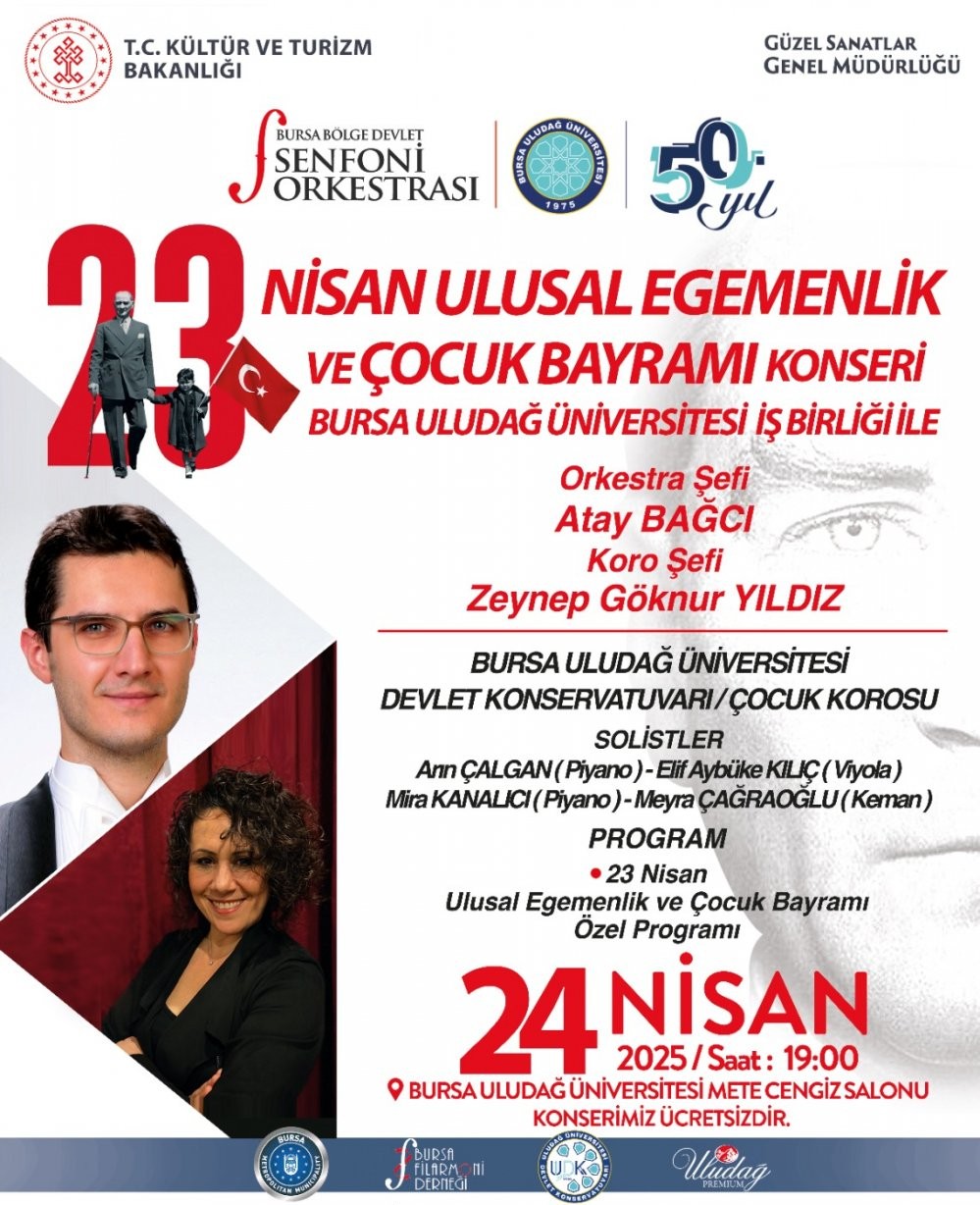 Konserde ayrıca, Bursa Uludağ Üniversitesi Devlet Konservatuvarı Çocuk Korosu da yer alacak. Koro, şef Zeynep Göknur Yıldız yönetiminde seslendireceği eserlerle, Atatürk’ün “küçük hanımlar, küçük beyler” diye seslendiği gelecek nesillere adanmış bu özel günü taçlandıracak. Orkestra şefliğini ise deneyimli genç orkestra şefi Atay Bağcı üstlenecek.