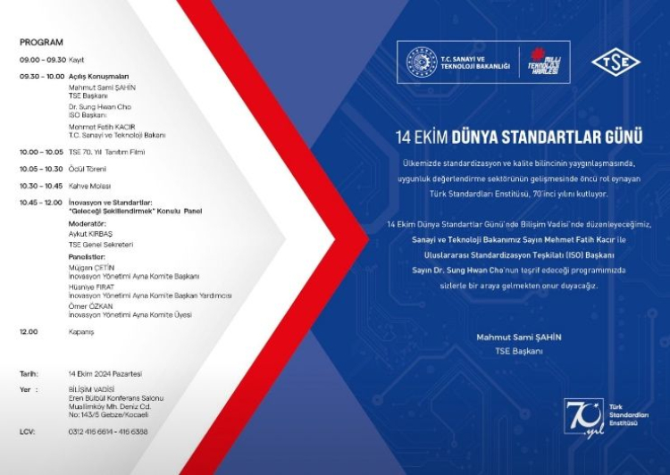 Bugün Gebze’deki Bilişim Vadisi’nde TSE 70. Yaşını kutlayacak. Bu kutlamaya ev sahipliğini TSE Başkanı Mahmut Sami Şahin yapacak. Kutlamaları Sanayi ve Teknoloji Bakanı Fatih Kacır ile birlikte Uluslararası Standartlar Organizasyonu(ISO) Başkanı Dr. Sung Hwan Cho’da katılacak.