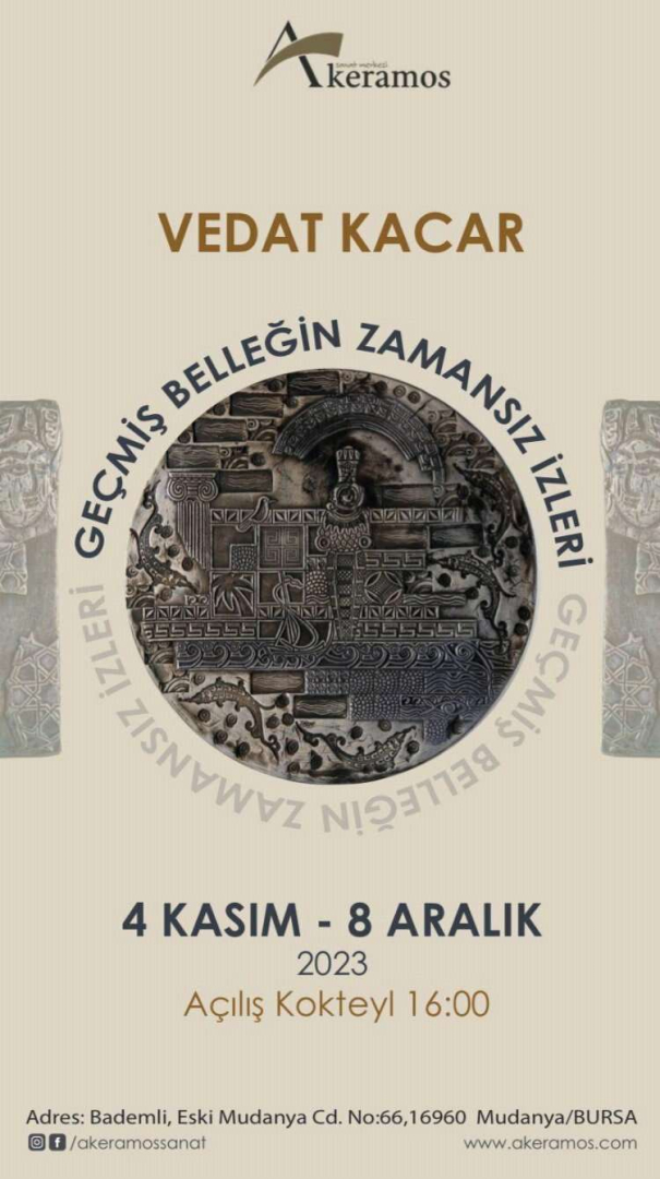 Bursa Bademli’deki Akeramos Sanat Galerisi ve Sanat Merkezi’nde sanatçı Doçent Vedat Kacar’ın “Geçmiş belleğin zamansız izleri” isimli bir seramik sergisi açıldı. Sergi 4 Kasım – 8 Aralık tarihleri arasında açık kalacak.