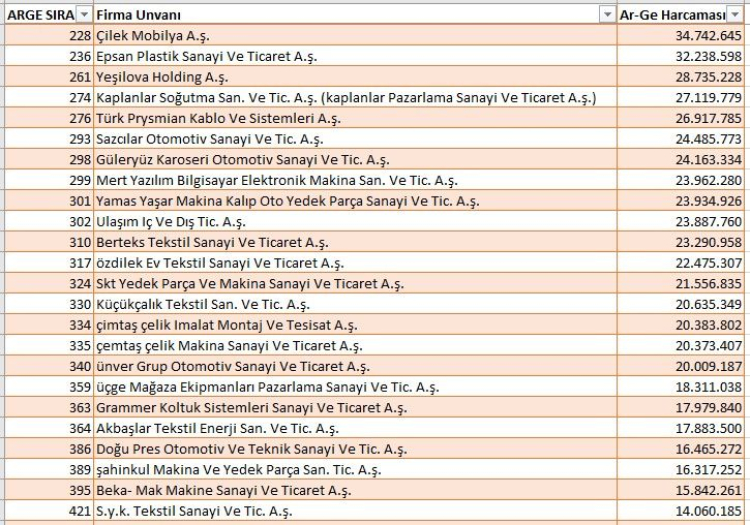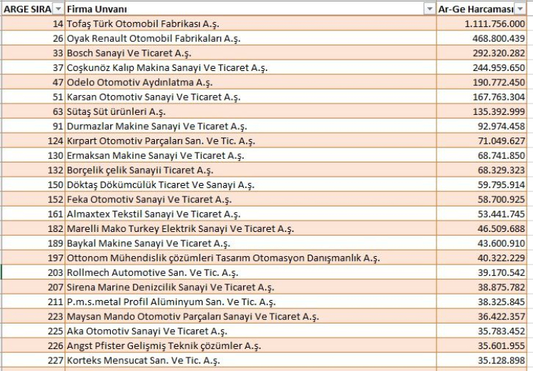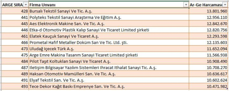 Türkiye 2023 Ar Ge sıralamasının İlk 250’sinde ise Bursa’dan 26 şirket bulunuyor. Ağırlıklı olarak otomotiv kuruluşlarının olduğu ilk 250 içinde dikkatimi çekenler ise SÜTAŞ’ın 135.392.999 TL ile Bursa 7. ve Türkiye 63.sü konumunda olması, 34.742.465 TL’lik harcama ile Çilek Mobilya’nın Türkiye’de 228. ve Bursa’da 25. sırada olması, Almatex tekstil firmasının 53.441.745 TL’lik harcaması ile Türkiye 161.si ve Bursa 14. sü olması ve Korteks’in 35.128.898 TL’lik harcaması ile Bursa 24.sü ve Türkiye 227’.si konumunda olması. Diğerlerinin hepsi otomotiv ile ilgili şirketler.