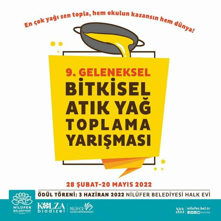 Bilindiği gibi Nilüfer Belediyesi’nin artık geleneksel hale gelen Bitkisel Atık Yağ Toplama Yarışması bu yıl da Kolza Biodizel ve Nilüfer İlçe Milli Eğitim Müdürlüğü iş birliği ile 9. kez düzenleniyor.