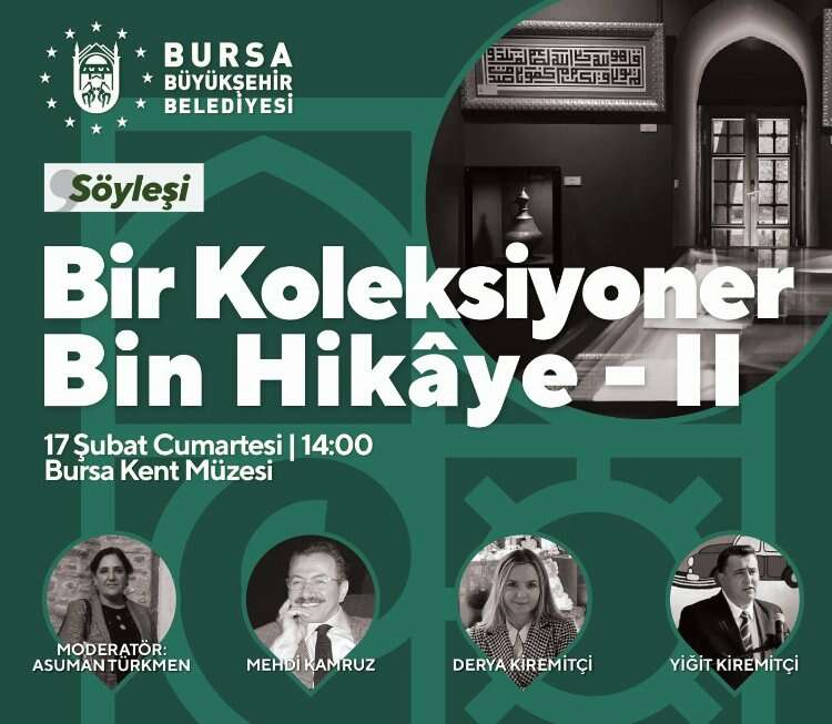 Bursa Büyükşehir Belediyesi 2024 yılı ile birlikte yeni bir kültürel etkinliğe imza attı. “Bir Koleksiyoner Bin Hikâye” isimli etkinlikte kentimizin koleksiyonerleri bir müzede konunun meraklıları ile buluşuyor. Etkinlik her ay düzenlenecek.