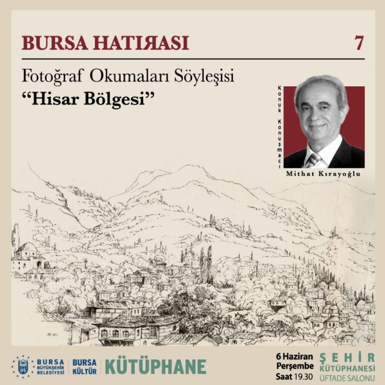 Bugün saat 19.30’da “Bursa Hatırası” fotoğraf okumaları söyleşisinin 7.sinde Haziran ayı konuğu, kent gönüllüsü, Mimar Mithat Kırayoğlu oluyor. Kırayoğlu, Bursa’nın tarihi Hisar Mahallesi’nin sokaklarının arasında bizleri hafıza yürüyüşüne çıkaracak. Etkinlik Şehir Kütüphanesi Üftade Salonu’nda yapılacak.