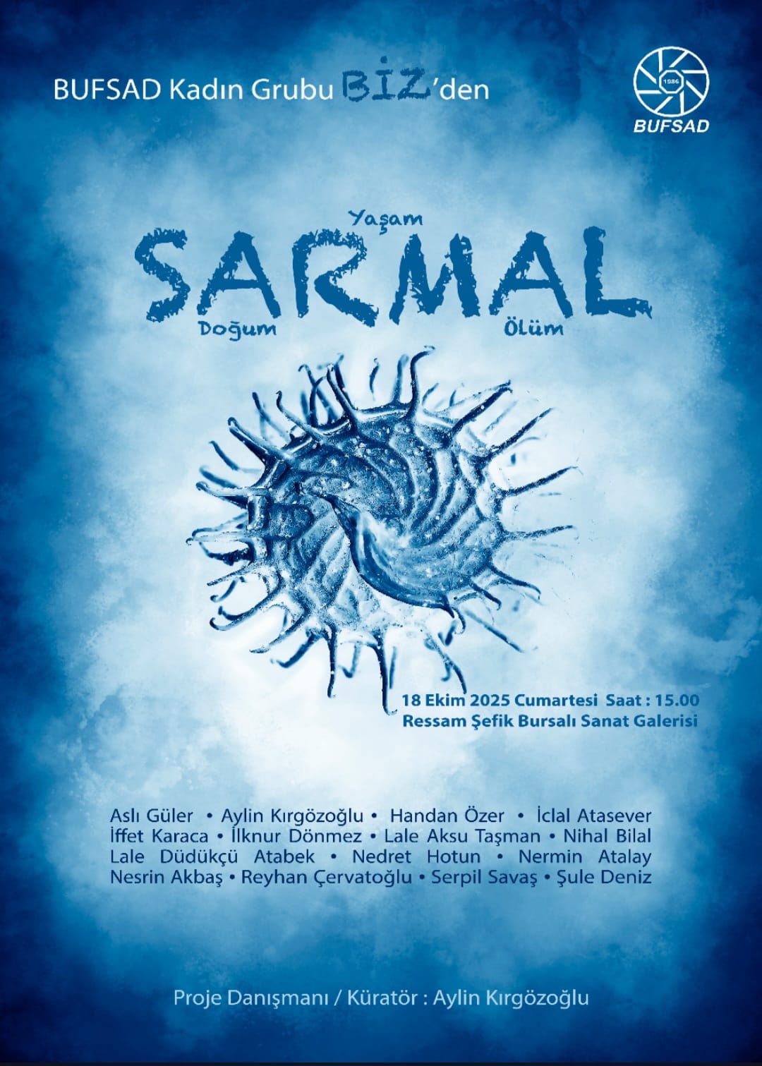 BUFSAD BİZ, 5. yılını ‘SARMAL’ sergisiyle kutluyor. Aylin Kırgözoğlu’nun küratörlüğünde, doğum-yaşam-ölüm döngüsünü cyanotype (UVA radyasyonu olarak bilinen 300 nm ila 400 nm aralığındaki sınırlı bir yakın morötesi ve mavi ışık spektrumuna duyarlı, yavaş reaksiyona giren, fotoğrafik bir baskı formülasyonudur) tekniğiyle yansıtacak sergi, 18 Ekim‘de Şefik Bursalı Sanat Galerisi‘nde açılıyor. Bu baskı tekniğine mavi baskı da deniyor.