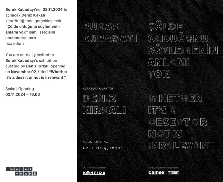 Şimdi ise cumartesi günü “Burak Kabadayı’nın İMALAT-HANE’de küratörlüğünü Deniz Kırkalı’nın üstlendiği, “Çölde olduğunu söylemenin anlamı yok” başlıklı kişisel sergisi açıldı.