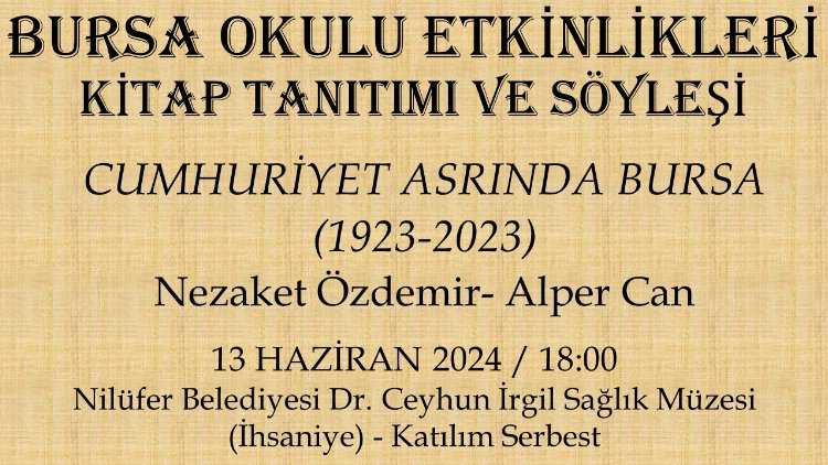 Nezaket Özdemir ve Alper Can’ın kaleme aldığı Cumhuriyet Asrında Bursa (1923-2023) kitabının tanıtımı 13 Haziran Perşembe günü saat 18.00’de Nilüfer Belediyesi Dr. Ceyhun İrgil Sağlık Müzesi’nde yapılacak.