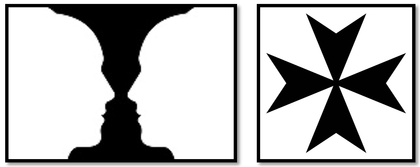 Rubin‘in Danca dilindeki iki ciltlik kitabında yer verdiği iki durumlu bir figüre bir diğer örnek de Malta haçıdır. (Önceden Amalfi haçı). Merkezi bir tepe noktasında dik açılarla birleşen, iki ucu simetrik olarak dışa doğru bakan dört ” V ” veya 4 ok ucu şeklindeki içbükey dörtgenden oluşan bir haç sembolü.