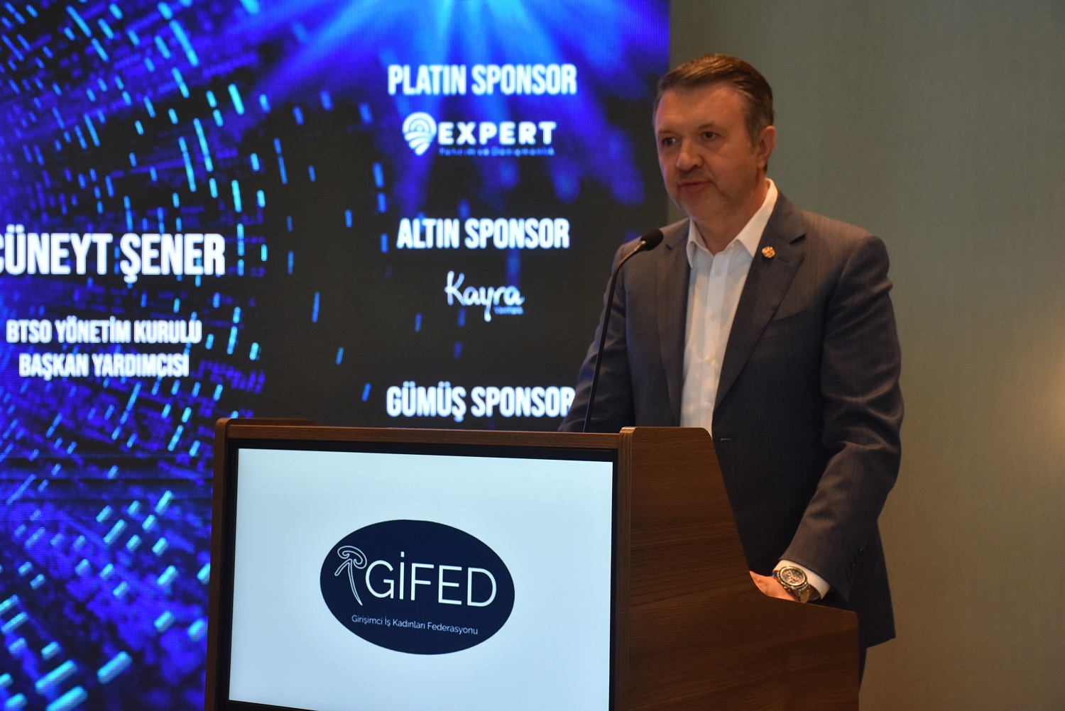 “GİFED Başkanı Oya Eroğlu’na, BTSO Başkanı İbrahim Burkay’a, BTSO Yönetim Kurulu Başkan Yardımcısı Cüneyt Şener’e, GİFED üyesi Afyonkarahisar İş Kadınları Derneği’ne (AFİKAD), Aydın İş Kadınları Derneği’ne (AYİŞKAD), Bursa İş Kadınları Ve Yöneticileri Derneği’ne (BUİKAD), Girişimci Kadınların Desteklenmesi Derneği’ne (GİKAD), İzmir İş Kadınları Derneği’ne (İZİKAD), Kadın İşveren Ve Sanayiciler Derneği’ne (KAİSDER), Kocaeli İş Kadınları Ve Yöneticileri Derneği’ne (KOİDER), Konya İş Kadınları Derneği’ne (KİKAD), Mersin Girişimci İş Kadınları Derneği’ne (GİŞKAD) ve yönetim kurulu üyelerine, tüm komisyon üyelerine teşekkürlerimi sunarım.