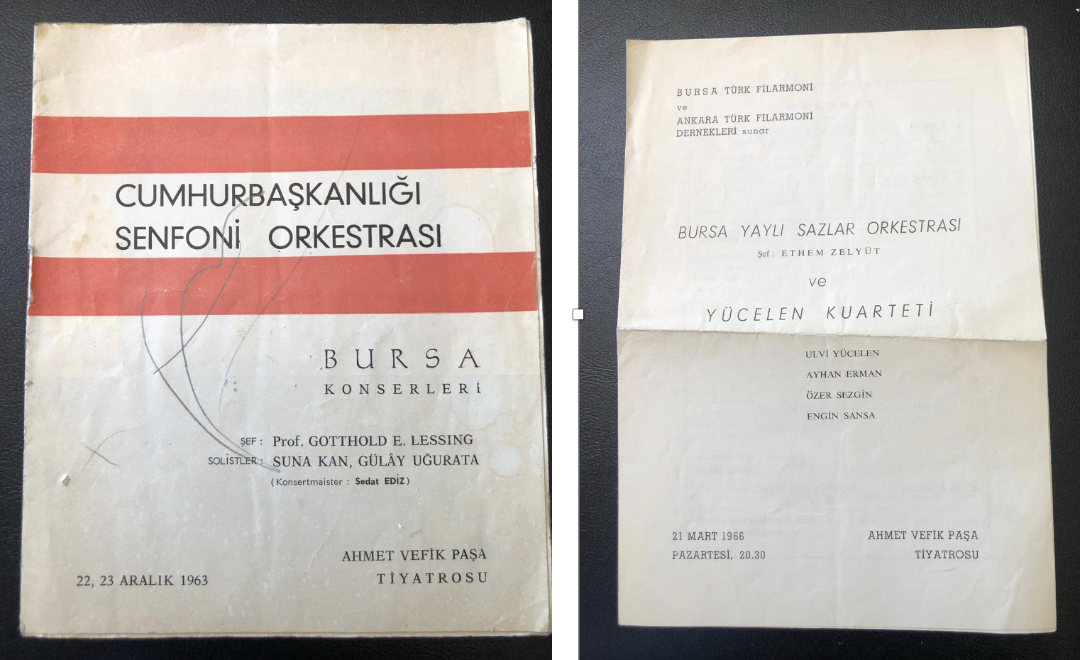 Sonra ise Gürer Aykal Hoca’nın sözünü ettiği 22-23 Aralık 1963’te Cumhurbaşkanlığı Senfoni Orkestrası’nın Bursa Konserleri kapsamında Şef Prof. Gotthold E. Lessing ve solistler Suna Kan ile Gülay Uğurata’nın (Son olarak BİFO’daydı ve 1995’de aramızdan ayrıldı) konserinin tanıtım broşürünü buldum. Bunlar beni çok mutlu etti. Broşüre baktığımda BBDSO’nun değerli sanatçılarından Burç Balcı’nın kayınpederi ve eşi Pınar Dalaysel Balcı’nın babası Oktay Dalaysel’in I. Keman grubu içinde olduğunu gördüm. Ayrıca BUÜ Devlet Konservatuarı’nın kuruluş sürecini yürüten Prof. Koral Çalgan hoca da o broşürde viyola çalanlar arasındaydı.