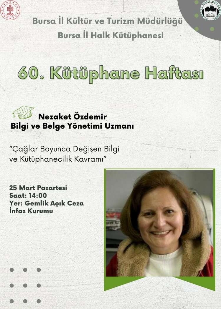 Bilgi ve Belge Yönetim Uzmanı Nezaket Özdemir, Bursa İl Kültür ve Turizm Müdürlüğü, Bursa İl Halk Kütüphanesi’nin 60. Kütüphane Haftası etkinlikleri kapsamında “Çağlar Boyunca Değişen Bilgi ve Kütüphanecilik Kavramı” konusunda bir konferans verecek. Bu konferans bugün Gemlik Açık Ceza İnfaz Kurumu’nda saat 14.00’de gerçekleşecek.