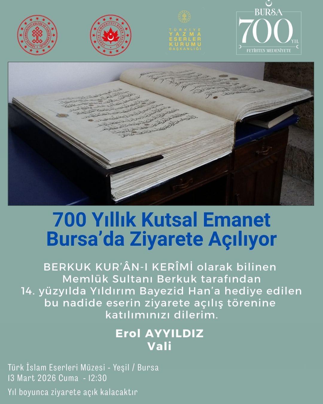 Bu değerli eser 13 Mart Cuma günü saat 12.30’da Yeşil’deki Türk İslam Eserleri Müzesi’nde ziyarete açılıyor. Eser yıl sonuna kadar izlenebilecek.