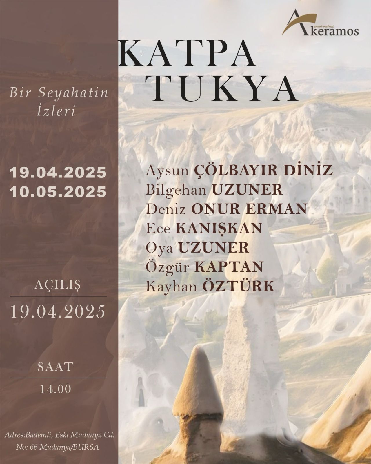 Sergi 19 Nisan 2025 Cumartesi günü saat 14.00’de sanatçı ve eğitmen Aysun Çölbayır Diniz’in sahibi olduğu Akeramos Sanat galerisinde açılacak.