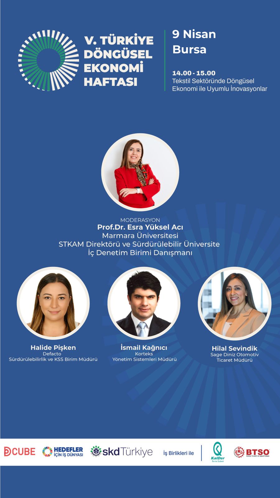 14.00-15.00 arasındaki Tekstil Sektöründe Döngüsel Ekonomi ile Uyumlu İnovasyonlar panelinin yöneticisi ise Marmara Üniversitesi, STKAM Direktörü ve Sürdürülebilir Üniversite İç Denetim Birimi Danışmanı Prof. Dr. Esra Yüksel Acı.