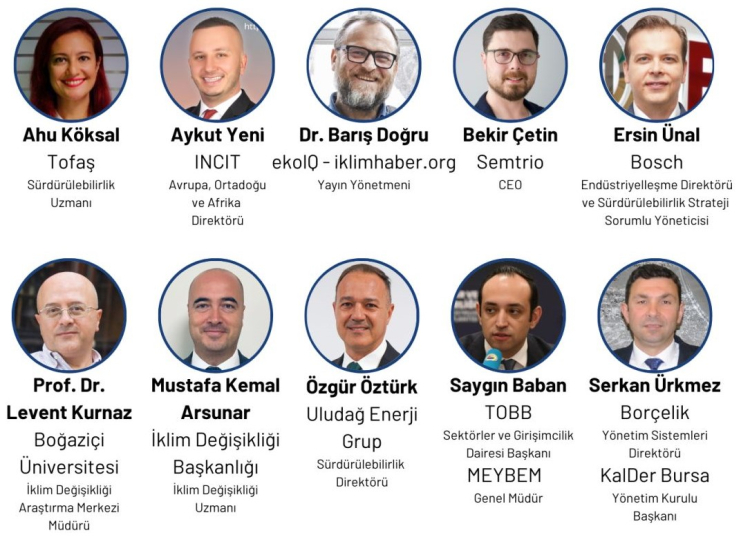 “EkoIQ ve İklimhaber.org Yayın Yönetmeni Dr. Barış Doğru, Boğaziçi Üniversitesi İklim Değişikliği Araştırma Merkezi Müdürü Prof. Dr. Levent Kurnaz, İklim Değişikliği Başkanlığı İklim Değişikliği Uzmanı Mustafa Kemal Arsunar, TOBB Sektörler ve Girişimcilik Dairesi Başkanı, Meybem Genel Müdürü Saygın Baban, Semtrio, CEO’su Bekir Çetin, INCIT Avrupa, Orta Doğu ve Afrika Direktörü Aykut Yeni, Borçelik Yönetim Sistemleri Direktörü, KalDer Bursa Yönetim Kurulu Başkanı Serkan Ürkmez, TOFAŞ Sürdürülebilirlik Uzmanı Ahu Köksal, Bosch Endüstriyelleştirme Direktörü ve Sürdürülebilirlik Stratejisi Sorumlu Yöneticisi Ersin Ünal, Uludağ Enerji Grup Sürdürülebilirlik Direktörü Özgür Öztürk.” konuşmacı olarak yer aldılar.