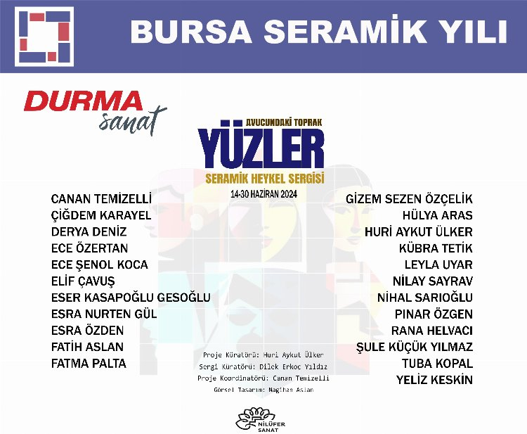Proje Küratörlüğünü Huri Aykut Ülker’in, Sergi Küratörlüğünü Dilek Erkoç Yıldız’ın, Proje Koordinatörlüğünü Canan Temizelli’nin yaptığı “Yüzler” Avucundaki Toprak Seramik Heykel Sergisi, Bursa‘da gerçekleşmesi planlanan 2. Uluslararası Seramik Bienali‘nin tanıtımını ve seramik sanatının bilinirliğini artırmak amacıyla düzenlenen etkinliklerin bir parçası olarak hayata geçirildi.